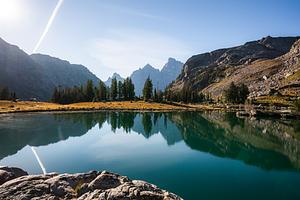 Lake Solitude in the Grand Tetons. The Tetons reflecting in alpine lake water early morning.