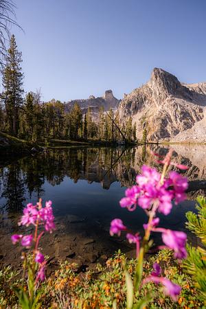 Twin Lakes in Sawtooth Mountains with pink wildflowers.
