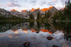 Alice Lake glowing mountain peaks at sunrise in the Sawtooth Range in Stanely, Idaho