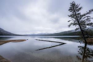 Alturas Lake Leaning Trees. Moody day in Stanley, Idaho with light snow.