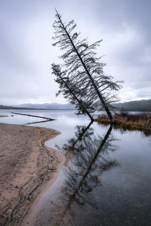 Alturas Lake Leaning Trees. Moody day in Stanley, Idaho with light snow.
