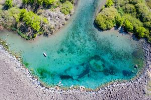 Drone shot of Blue Heart Springs in the summer time. Bright blue water lake with kayakers.