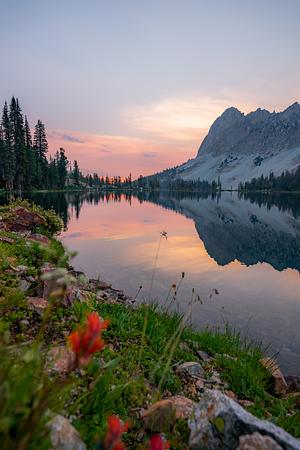 Stanley, Idaho's Alice Lake has stunning views! This Alpine Lake Located in the Sawtooth Mountains is gorgeous. Indian Paintbrush in the foreground of the majestic peaks.