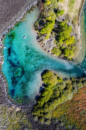 Drone shot of Blue Heart Springs near Hagerman, Idaho. Ariel view bright blue water lake in Idaho.